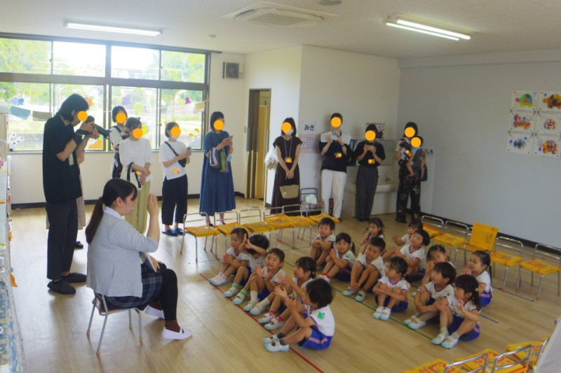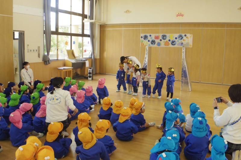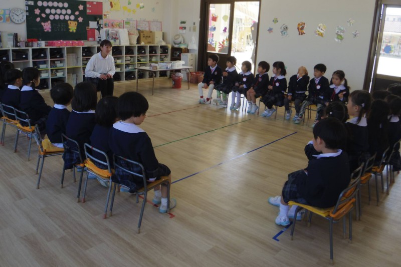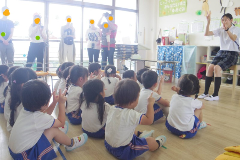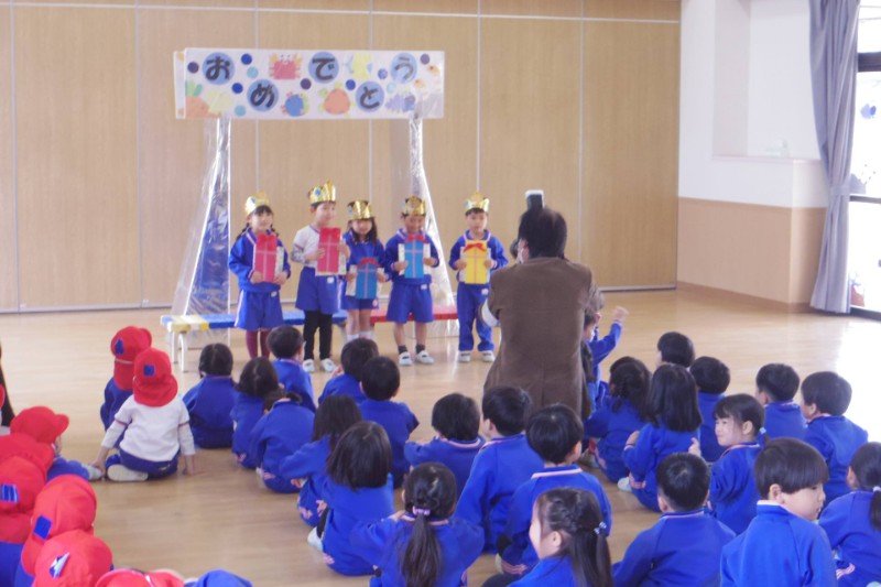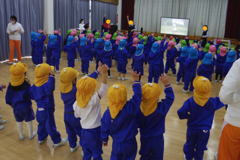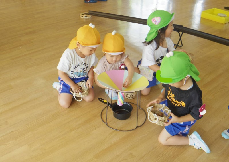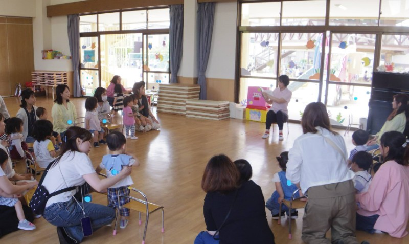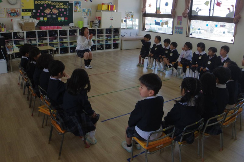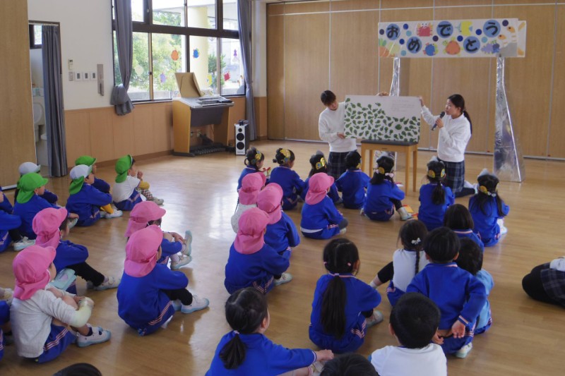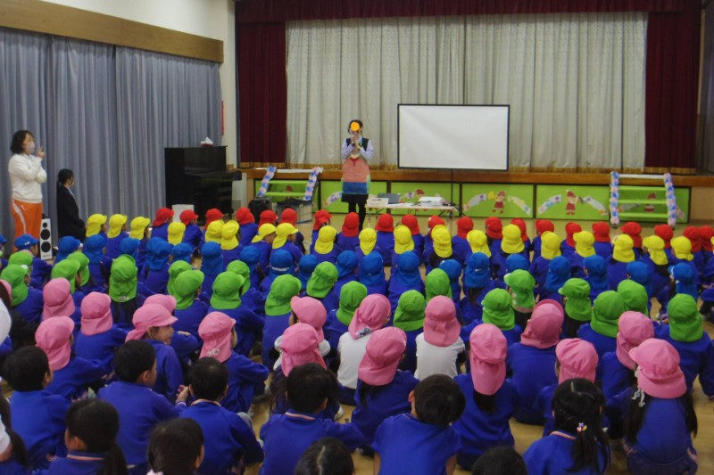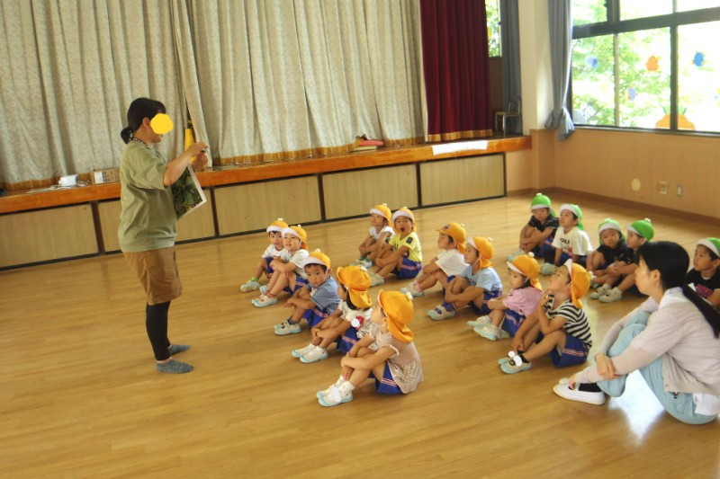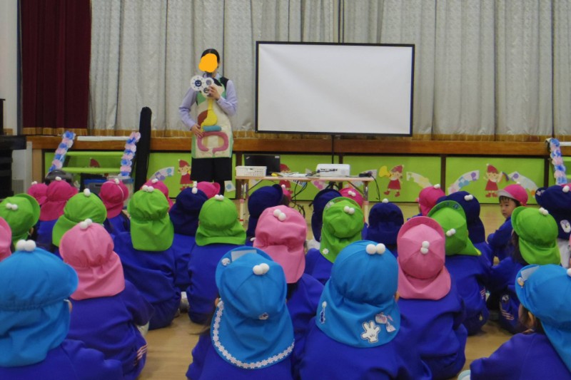 好き嫌いせず野菜も食べ、よく寝て、よく体を動かすと、お腹の調子も良くなる事を教えてもらいました。エプロンシアターやスライドを使い、最後は体操で体を動かして、お腹に大切な事を楽しく学べた時間でした。