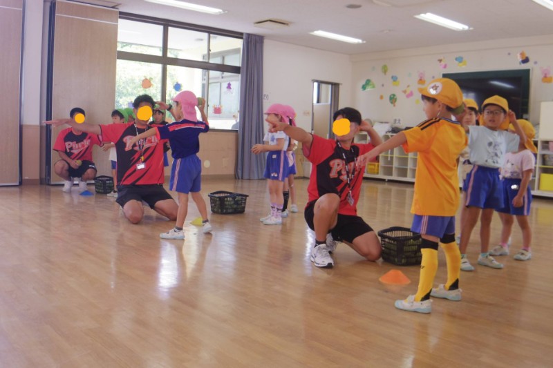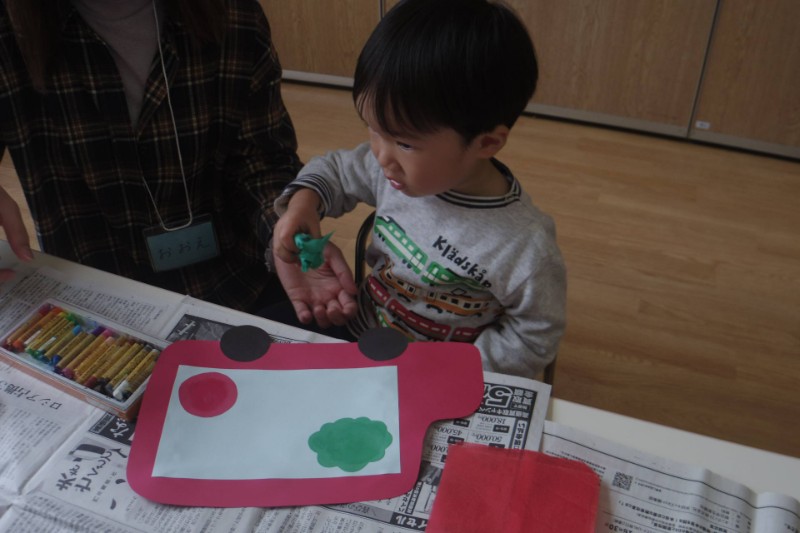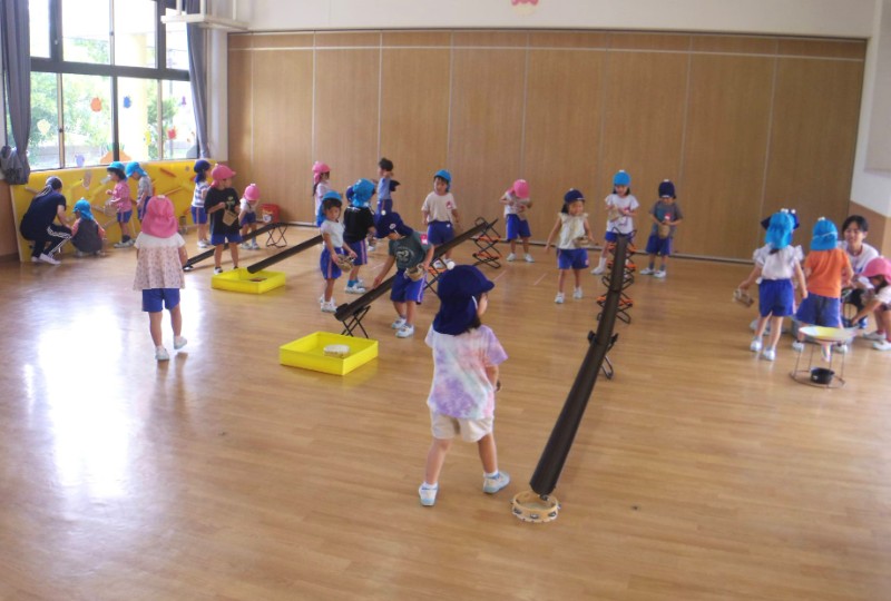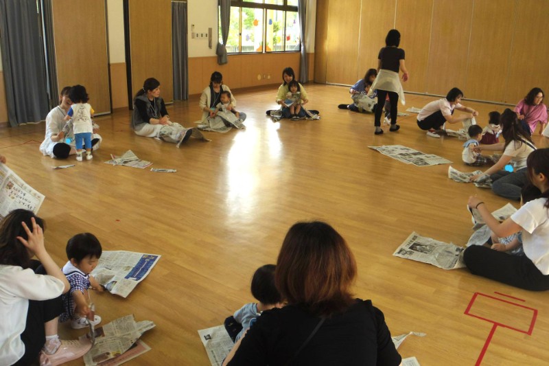 製作の後は、フープで電車ごっこをしたり、体操をして楽しみました。