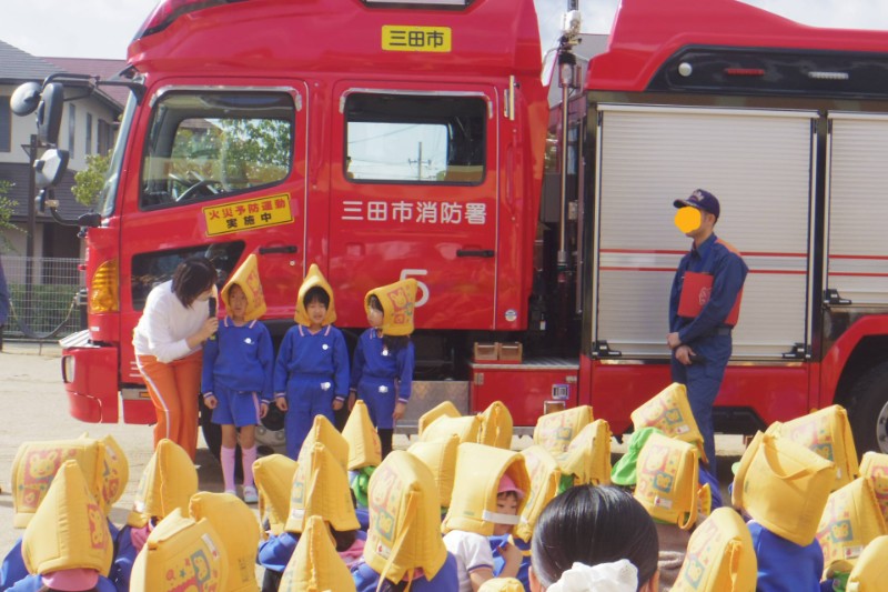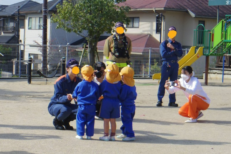 今日は三田消防署から消防士さんにお越し頂き、避難訓練の様子を見て頂きました。消防士さんと一緒に「おはしもち」のお約束を確認しましたよ。