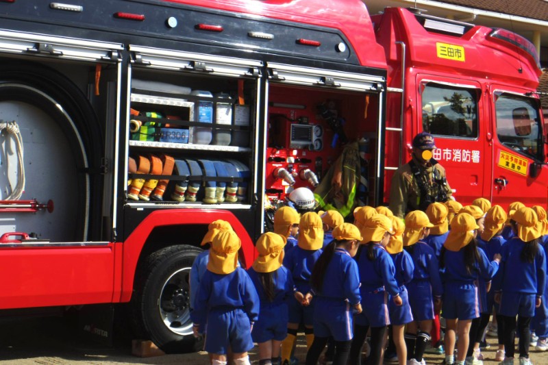 最後に勤労感謝の日に因んで、プレゼントを渡しました。近くで消防車を見る事が出来て、興味津々な子ども達でした。