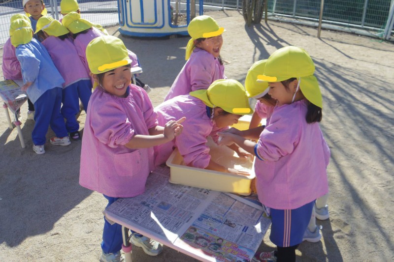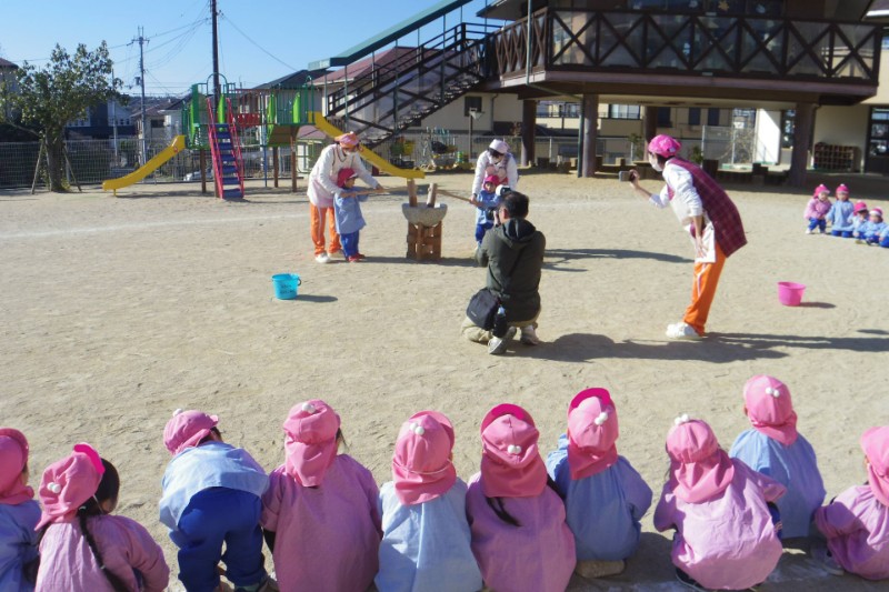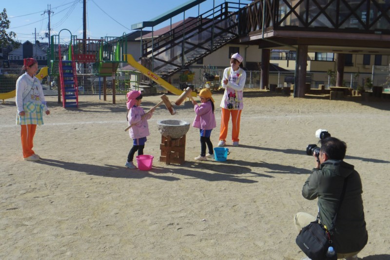 今日は杵・臼を使って餅つきをしました。なかなか道具を実際に使う機会も減ってきましたね。「ぺったん、ぺったん!」の掛け声と共に、楽しんでくれたようです。もち米から柔らかいへの変化に、興味津々の子ども達でしたよ。日本の伝統を大切にしたいなと改めて思う機会となりました。